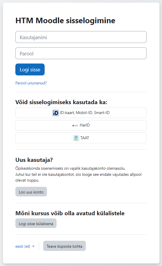 Kui sul ei ole veel HTM Moodle kasutajakontot saad selle endale ise luua. Uue konto loomiseks vali "Loo uus konto".