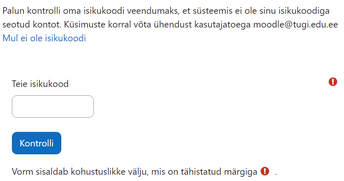 Enne konto loomist palub süsteem sisestada kontrolliks isikukoodi. Isikukoodi kontroll on vajalik, kuna HTM Moodle'is tohib igal kasutajal olla ainult üks konto ja see konto peab olema seotud kasutaja isikukoodiga.